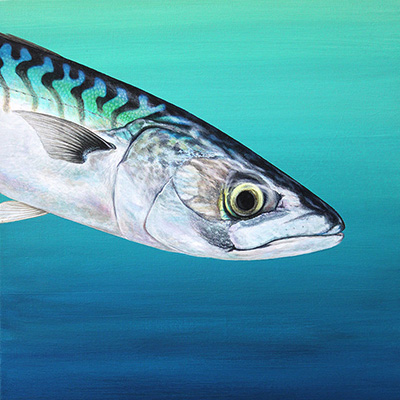 Atlantic mackerel with a turquoise sea background, painted in acrylic on canvas. Print from £75