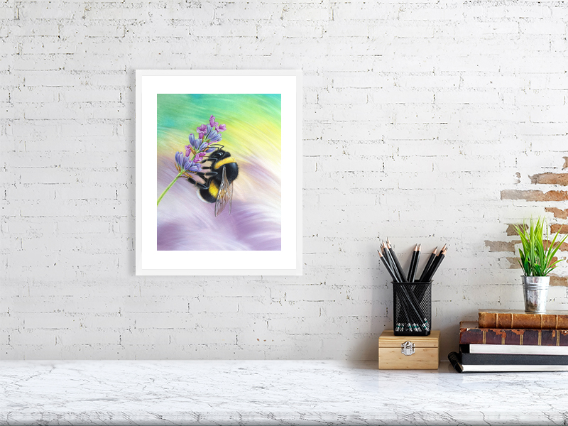 The buff-tailed bumblebee featured in this print, is the largest of the bumblebees and are found in lowland areas. They are social insects and form small colonies of 50 individuals in a nest with a single queen. Bumble bees feed on nectar, which they gather to add to the stores in the nest, and collect pollen to feed their young.
