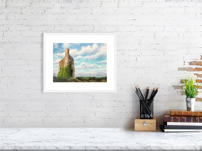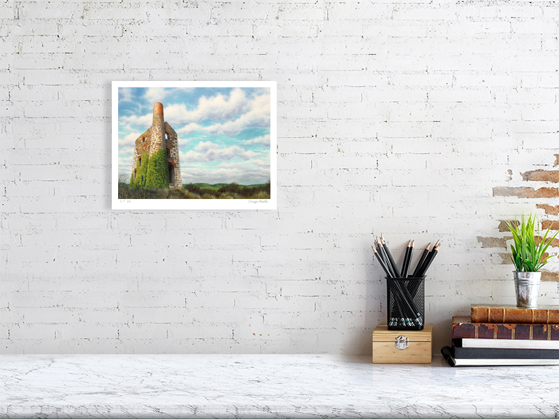 This painting is shows an engine house at Wheal Uny, a historic mining site to the south of Redruth, Cornwall. It mined tin and copper, and has two engine houses, a number of shafts and a chimney, dating from around 1800.