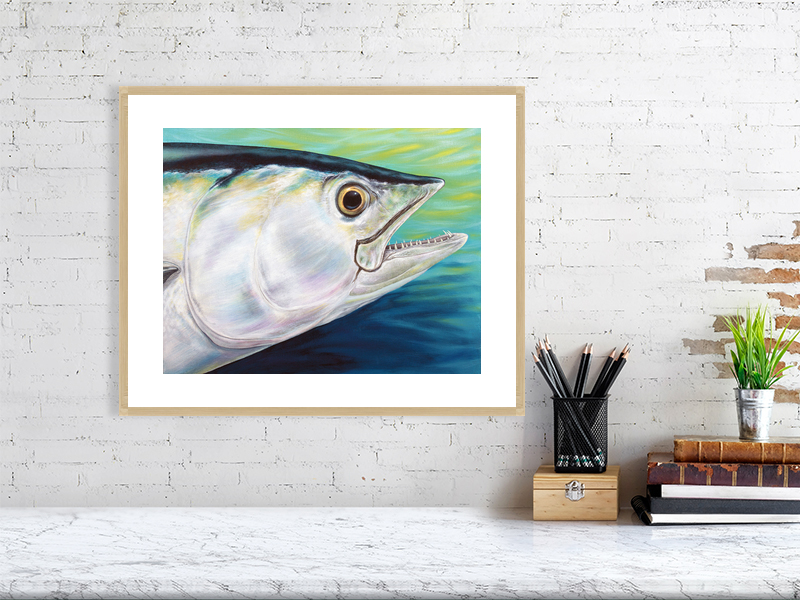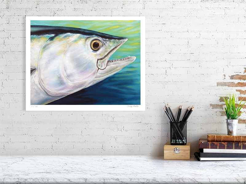 Dogtooth Tuna is a large pelagic fish, also known as a white tuna, and got its name because of the external resemblance to tuna, although it isn’t one. Instead, it is a bonito. It can reach up to 2.5m in length and weigh up to 130kgs. It is widespread throughout the tropical waters, and hunts small schooling fish and squid. The dogtooth tuna is My original painting in acrylics, is available as a fine art print, and shows a close up view of the tuna’s head.