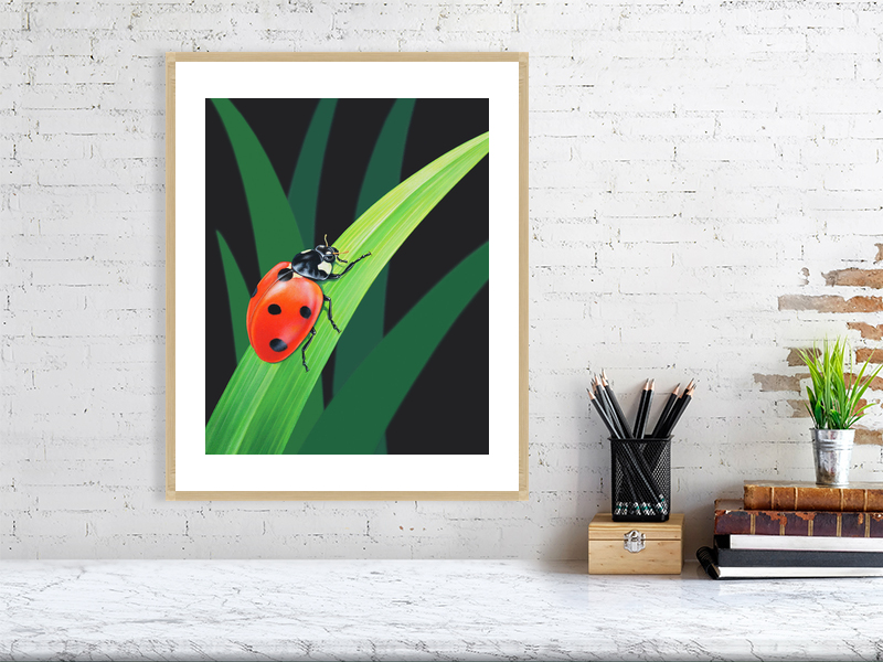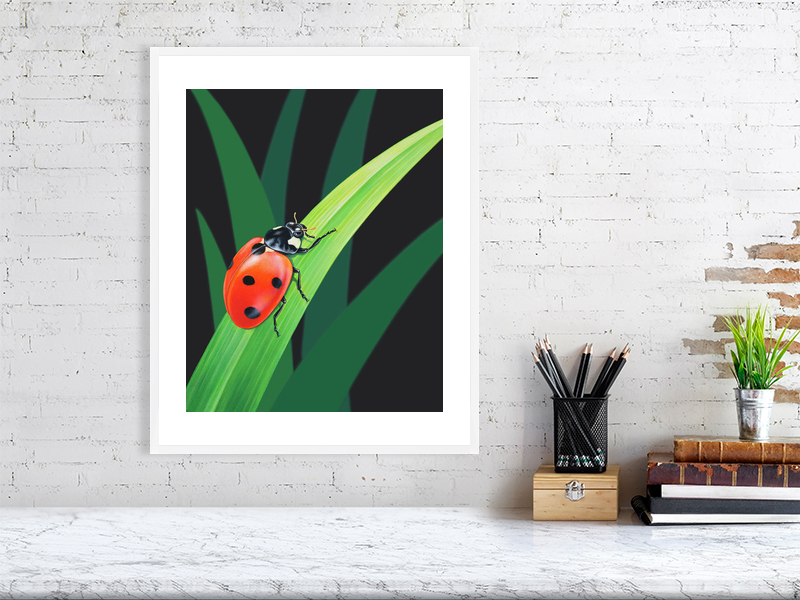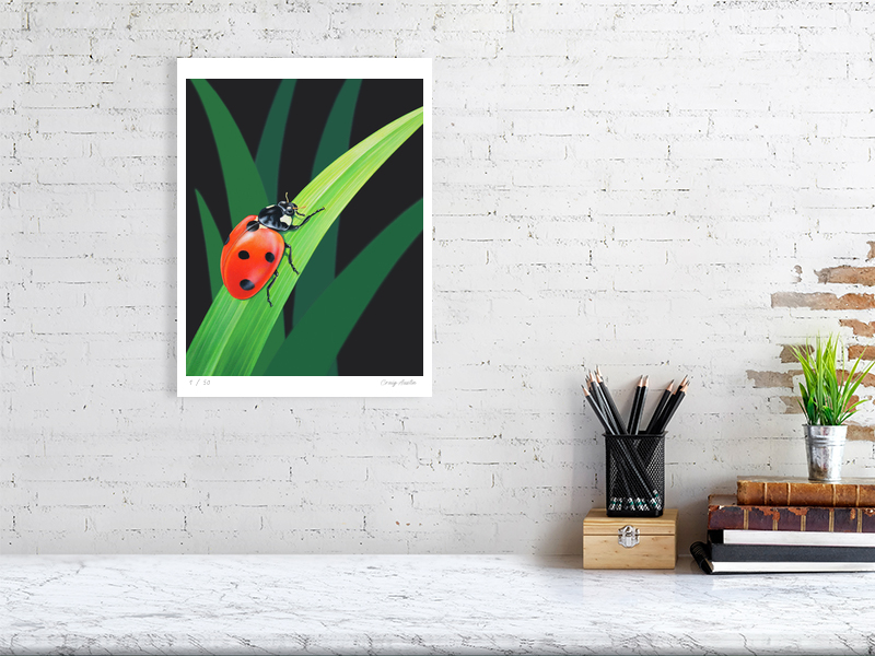Seven spot ladybird resting on a blade of grass, painted in acrylic. Available as a signed limited edition print unframed, or open edition in a white or oak frame.