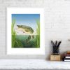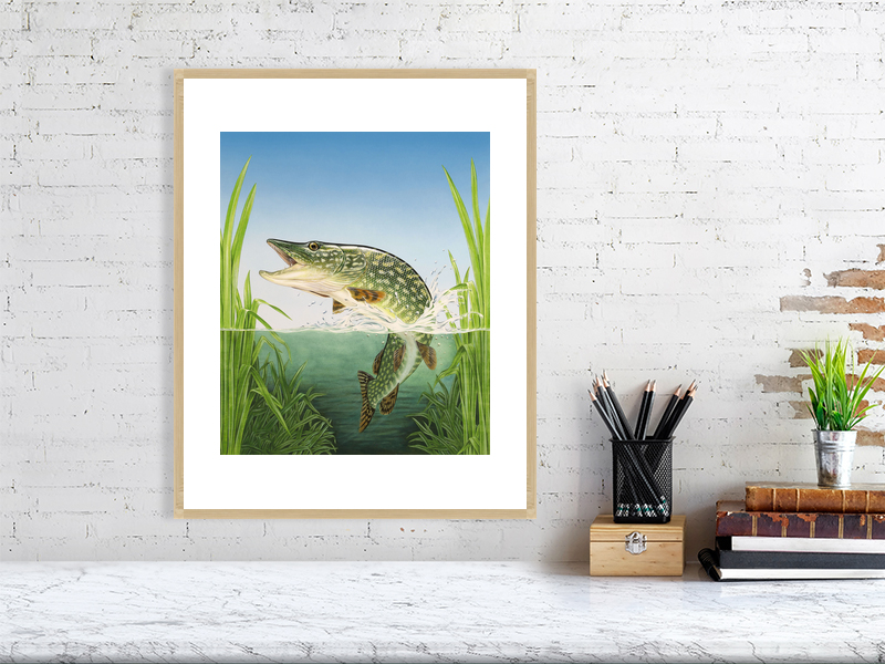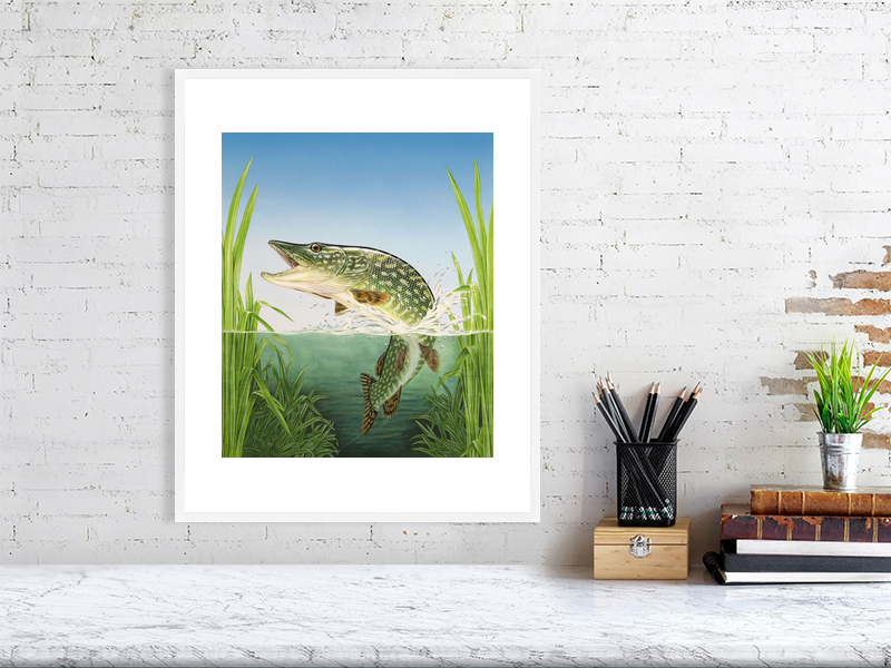 Northern pike leaping the water, painted in gouache. Available as a signed limited edition print unframed, or open edition in a white or oak frame.