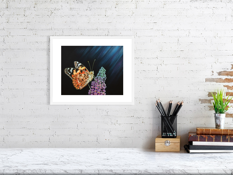 Painted lady butterfly feeding on a buddleia flower, painted in acrylic. Available as a signed limited edition print unframed, or open edition in a white or oak frame.