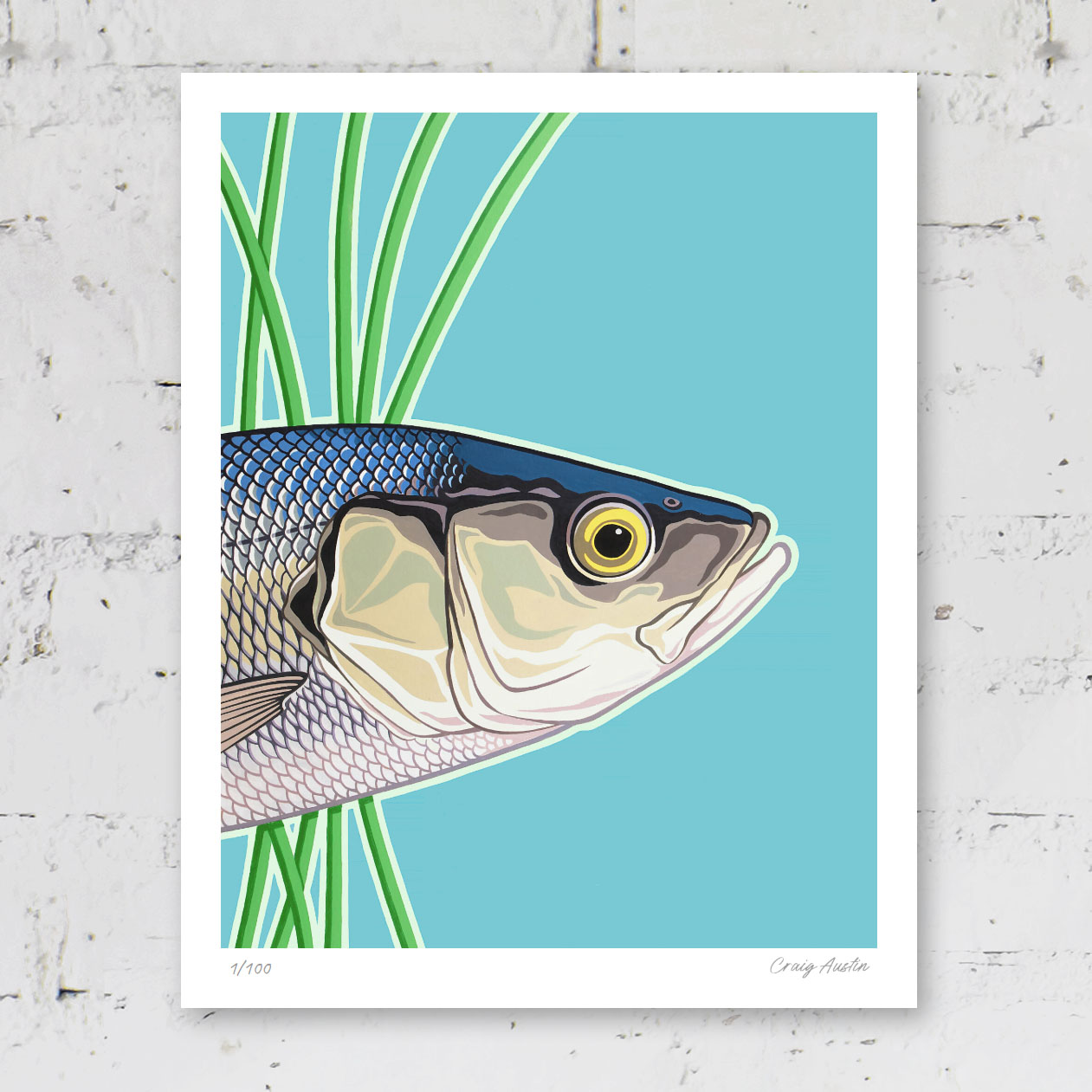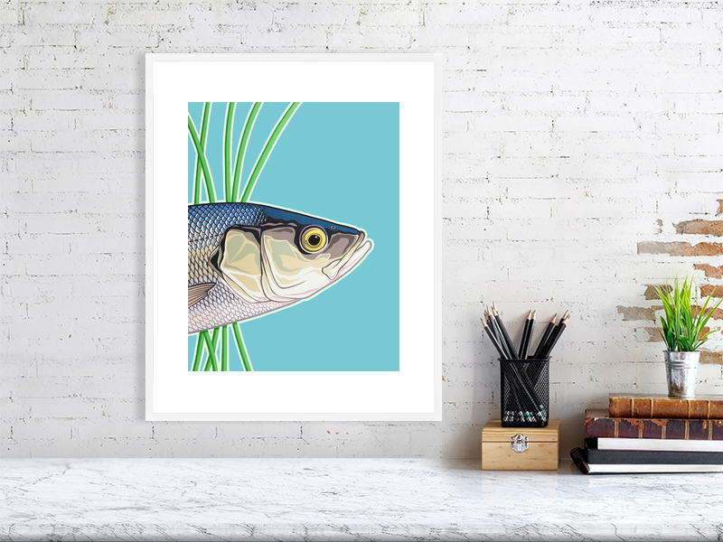 Poster style sea bass, hand-painted in acrylic. Available as a signed limited edition print unframed, or open edition in a white or oak frame.