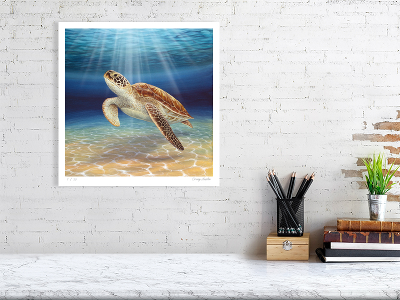 Green sea turtle in the shallows, painted in acrylic on canvas. Available as a signed limited edition print unframed, or open edition in a white or oak frame.