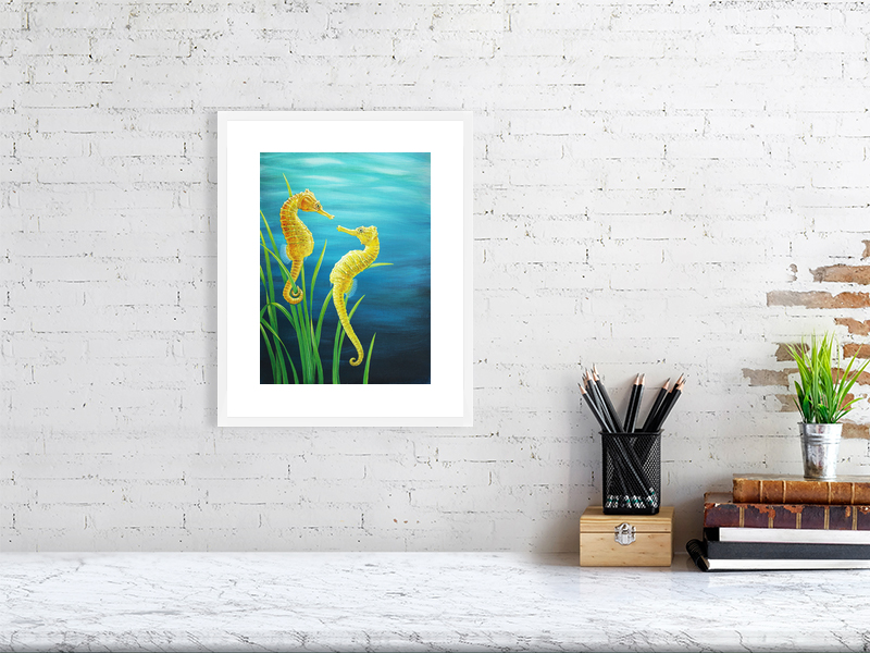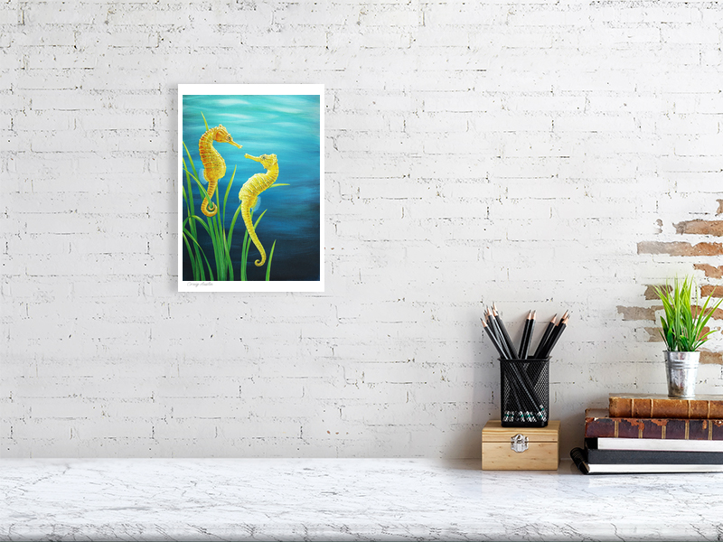 Featured in this painting is a short-snouted seahorse, and they are found in shallow waters, often in estuaries or associated with seagrass meadows. It has a distinctive body with its head, angled to the curved body is finished with a curled tail. Seahorses are fish, and share many of the same features, including gills, fins and a tail.