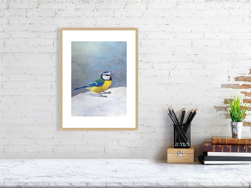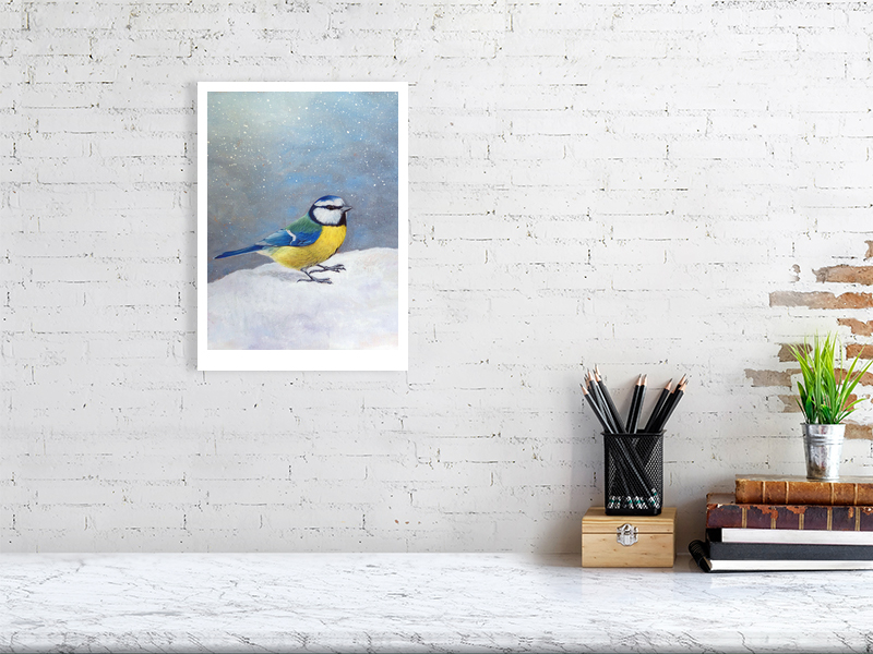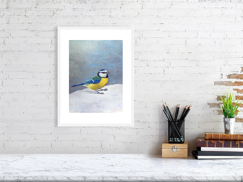 Blue tit in the snow, painted in acrylic on canvas board. Available as a signed limited edition print unframed, or open edition in a white or oak frame.